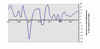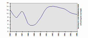 Das wirtschaftliche Wachstum war, wie aus der Graphik zu entnehmen ist, bis zu Beginn der 60er Jahre auf hohem Niveau. Die Wirtschaft war jedoch immer noch sehr von der Landwirtschaft geprägt. Wegen der Missernte 1960 und aufgrund des politischen Bruchs mit dem damaligen Partner Sowjetunion, kam es Anfang der 60er Jahre zu einer der größten Hungerkatastrophen in der Geschichte Chinas. 1961 bis 1976 war der erste „move to the right“ (Minami 1994, S.7). Die streng marxistischen Regeln wurden erstmals gelockert. Der staatliche Einfluss in der Wirtschaft wurde zurückgefahren. Zum Teil wurde das Management in der Industrie unabhängiger und die Bauern durften nach Feierabend eigene Felder bestellen. 1966 kam es aufgrund der Kulturrevolution zu schweren innenpolitischen Unruhen, die sich auch auf die wirtschaftliche Entwicklung auswirkten. Die Reformen begannen 1976 mit dem Tode Maos. Danach wurde die Politik eher nach ökonomischen Bedürfnissen als nach ideologischen Zielvorstellungen ausgerichtet (Vgl. Romich 1991, S.7). Das neue Ziel war bis zum Jahre 2000 zu den größten Wirtschaftsmächten der Welt zu gehören. Dazu wurden auch große Infrastrukturprojekte in Angriff genommen. Der Bau neuer Verkehrswege und der Aufbau von Infrastruktureinrichtungen zur Energieversorgung bekamen höchste Priorität. Da ausländisches Kapital u.a. auch für die Infrastruktur benötigt wurde, wurden Gesetze geändert und 1979 erstmals Sonderwirtschaftszonen eingerichtet. Schnell begann die Wirtschaft stark zu wachsen. „Overall the first decade of China`s economic reforms since Mao`s death was outstandingly successful“ (Nolan 1990, S.21). Von 1952 bis 1985 wuchs die Wirtschaft Chinas um 720%. Während die Landwirtschaft nur um etwa 200% wuchs, erweiterte sich die Industrie um 2900%. (Zahlen aus: State Statistical Bureau People`s Republic of China 1986, S.41) 1952 war der primäre Sektor noch der bei weitem größte Sektor mit 57,7% Anteil am Volkseinkommen. Der sekundäre Sektor mit 23,1% und der tertiäre Sektor mit 19,2% waren vergleichsweise klein. 1985 dominierte bereits der sekundäre Sektor mit 52,8% deutlich vor dem primären mit 32,4% und dem tertiären mit 14,8%. (Vgl. Minami 1994, S.11) China wurde immer mehr von einem Agrarland zu einem Industrieland. Seit Mitte der 80er Jahre wurden nach und nach große Wirtschaftsreformen eingeleitet. Privatwirtschaft wurde in viel größerem Umfang als bisher erlaubt. Marktwirtschaft wurde mehr und mehr eingeführt. Preismechanismen regelten bald Angebot und Nachfrage in immer mehr Bereichen der Wirtschaft. In fast allen Teilen der Wirtschaft wurden Auslandsinvestitionen und ausländische Beteiligungen erlaubt und durchgeführt. Die Niederschlagung der Demokratiebewegung 1989 unterbrach die wirtschaftlichen Reformen nur kurz. Auch die ausländischen Investitionen flossen bald wieder. Die großen Infrastrukturbereiche wie Energieversorgung, Verkehrswege und Bildungseinrichtungen blieben jedoch eher in staatlicher Hand. Abb. 2 : Wachstum der Wirtschaft 1985-1996